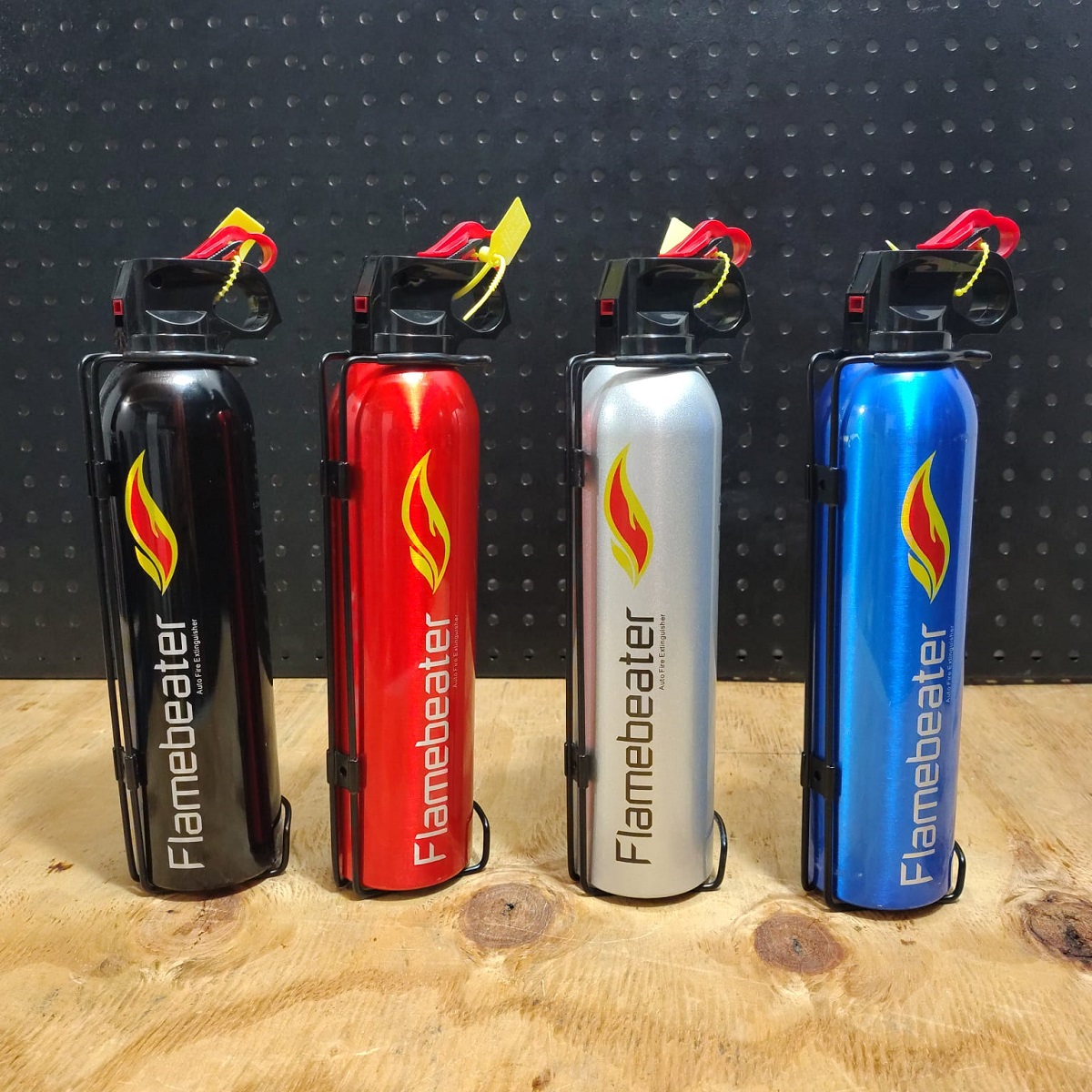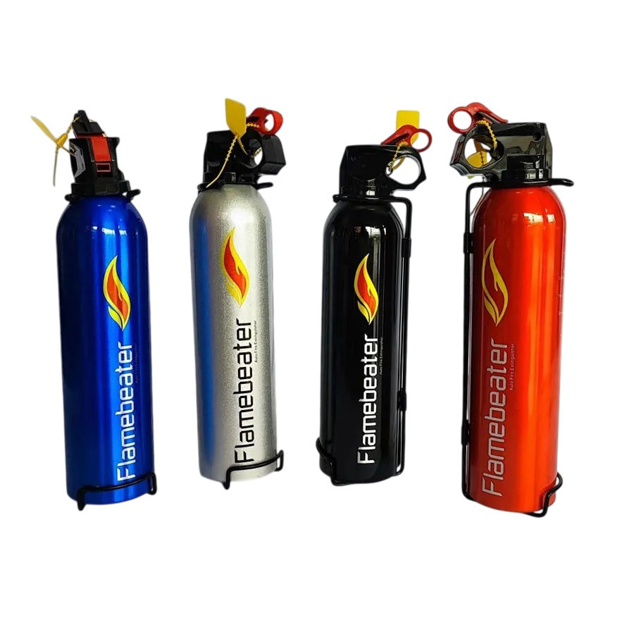 El extintor de lujo Flamebeater es un dispositivo compacto y portátil, diseñado para sofocar pequeños incendios en motores o interiores de vehículos y motos. Utiliza polvo químico seco (ABC) o espuma para combatir fuegos de tipo A (sólidos), B (líquidos inflamables) y C (eléctricos), ofreciendo seguridad con un diseño estético